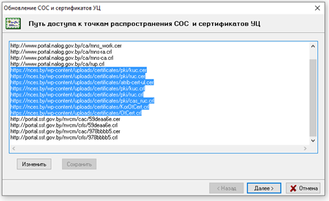 Если в вашем персональном менеджере нет этих строк, то это говорит о том, что у вас используется устаревшая версия менеджера сертификатов. В таком случае можно нажать кнопку «Изменить», скопировать эти ссылки и вставить их, как на скриншоте ниже, нажать кнопку «Сохранить», и выполнить обновление, следуя указаниям мастера.