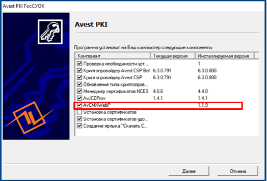 При установке удостоверьтесь, что компонент AvCMXWebP отмечен и будет установлен: