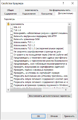 - установите галочки на пунктах TLS 1.0, TLS 1.1, TLS1.2. Затем нажмите "Применить" и "ОК".