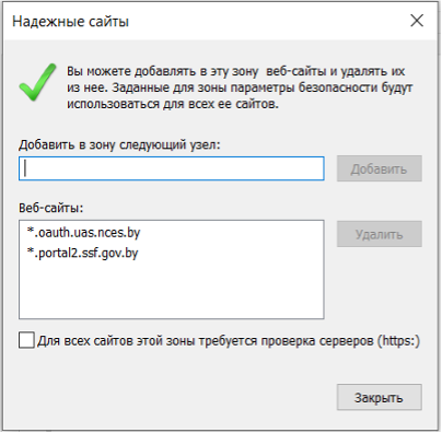 В поле "Для всех сайтов этой зоны требуется проверка серверов (https:)" - галочки не должно быть, при наличии - снимите. В поле "Добавить в зону следующий узел" пропишите *.portal2.ssf.gov.by и нажмите "Добавить". Затем пропишите и добавьте *.oauth.uas.nces.by.