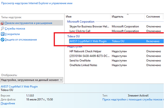 Для проверки версии плагина AvCMXWebP запустите браузер Internet Explorer и выберите пункт меню «Сервис» (может выглядеть как шестеренка) > «Настроить надстройки» (надстройки, управление надстройками). В открывшемся окне «Управление надстройками» следует выбрать: типы надстроек > «Панели инструментов и расширения; отображать > «все надстройки»;