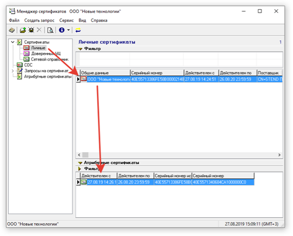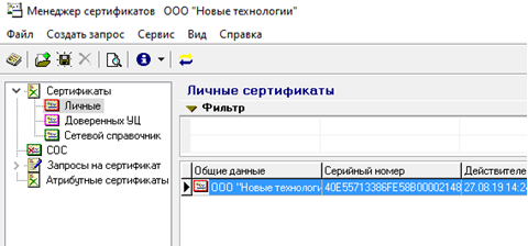4. Убедитесь, что Ваши сертификаты (основной и атрибутный) действительны и присутствуют в Персональном менеджере сертификатов Авест